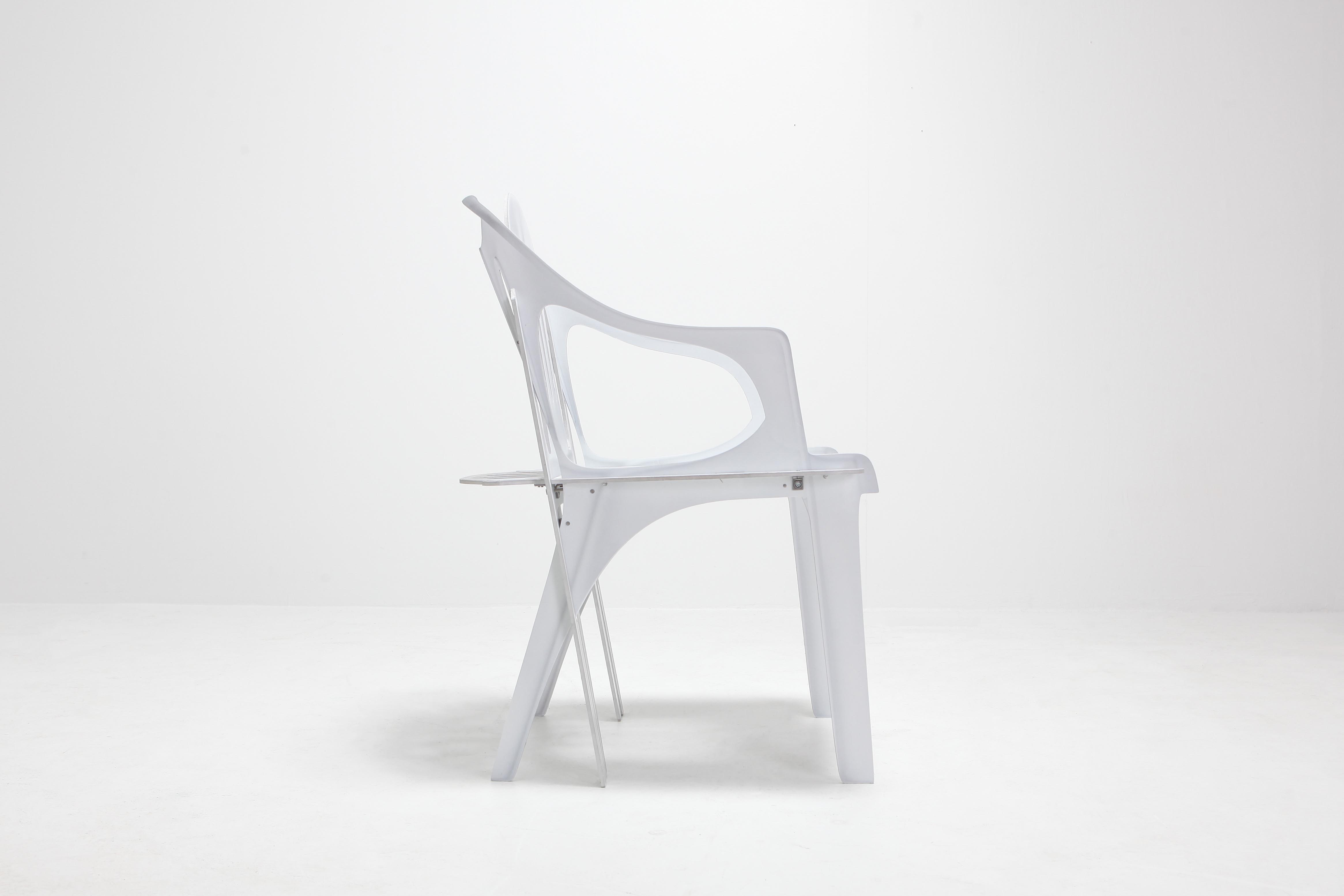 The installation ‘’Flatscreen’’ is a visual investigation into the relationship between a physical object and it’s digital counterpart. For it’s omnipresence in the digital and physical realm we chose the monobloc garden chair (it’s conception not being possible without the help of computer modeling software) as a perfect candidate to represent both worlds. By flattening the side, front and top view we create flat duplicates of the chair from which we construct a new 2D representation. On these flat views we print a render of the 3D digital representation to mimic the original spatiality of the chair. The capturing of 3D space on a 2D surface has always played a major role for mankind to be able to understand it’s surroundings (paintings/photographs).